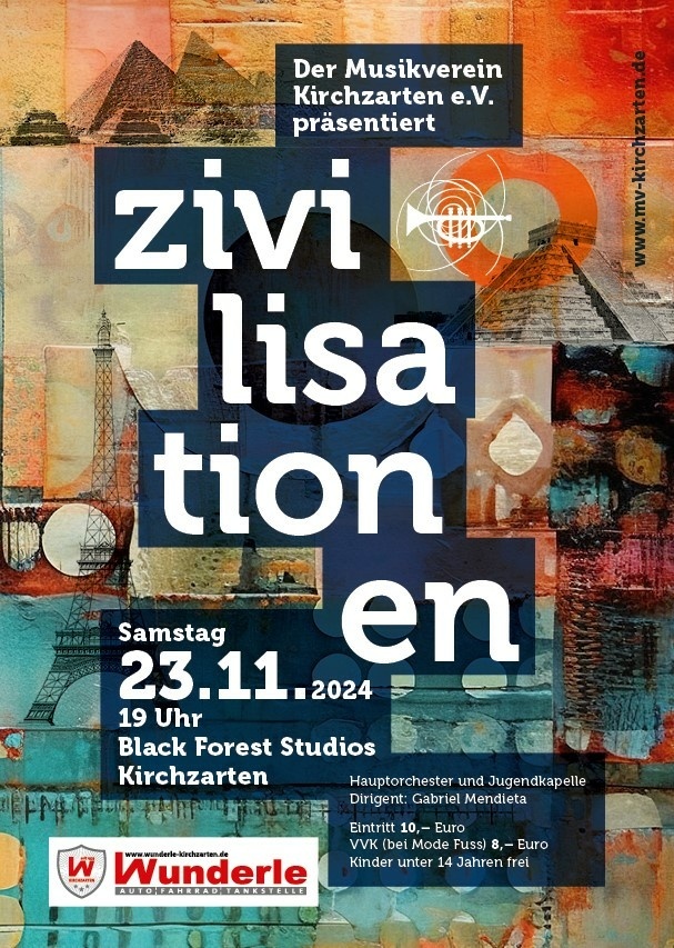 so bunt wie unsere Welt sind die Klänge der verschiedenen Zivilisationen. Erleben Sie mit dem Musikverein Kirchzarten pulsierende Rhythmen, majestätische Hymnen und feine Melodien aus diversen Epochen.