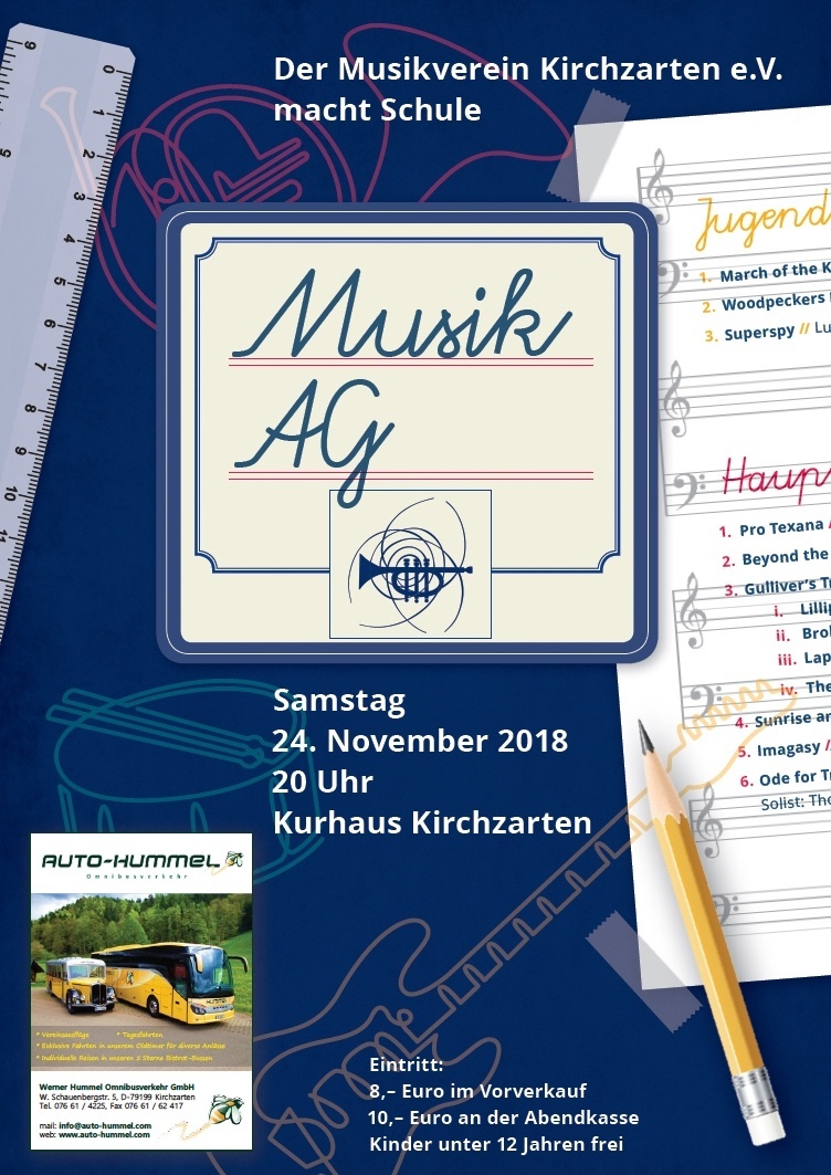 Musikverein Kirchzarten macht „Schule“unter dem Motto „Hören, Staunen, Entdecken“ lädt der Musikverein am Samstag, den 24. November 2018 um 20.00 Uhr seine Zuhörer ins Kurhaus Kirchzarten ein, um sich gemeinsam an die schönen Momente der Schulzeit zu erinnern.