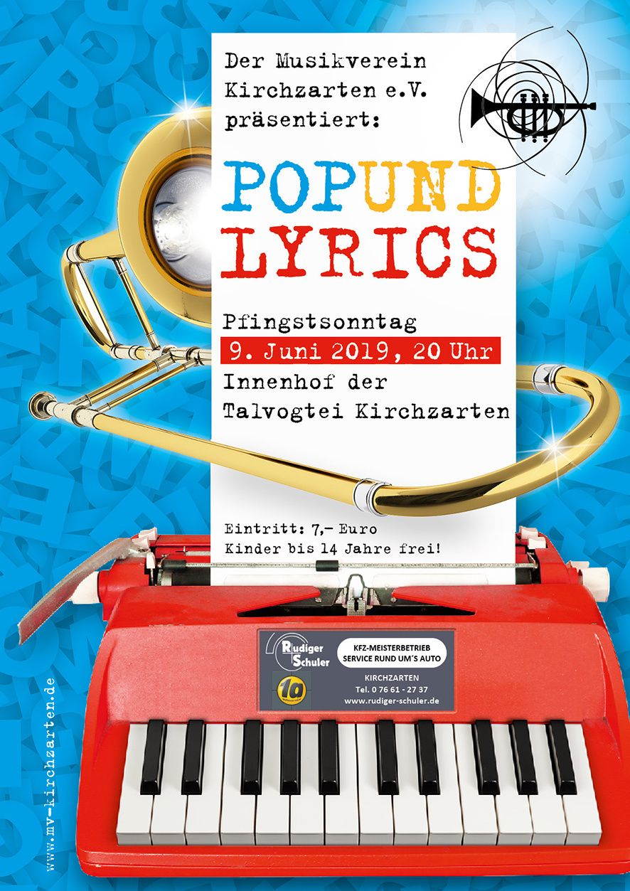Musikverein Kirchzarten präsentiert Pop and LyricsUnter dem Motto „Textsicher“ erwartet das Publikum am Pfingstsonntag, den 09.06.2019 um 20.00 Uhr im Schlosshof der Talvogtei eine Reise durch die verschiedenen Jahrzehnte der Popmusik.