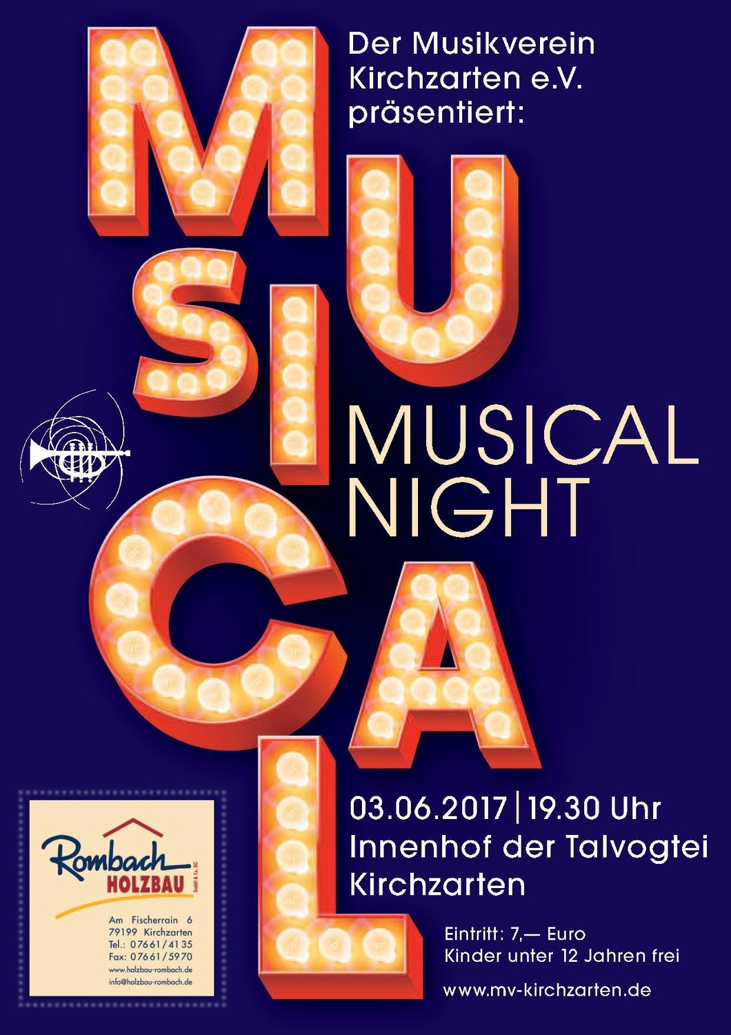 Liebe Konzertbesucher,der Musikverein Kirchzarten lädt Sie ein zu einem Abend voller bekannter Melodien und Ohrwürmer. Eine Nacht der Musicals erwartet Sie im Schlosshof der Talvogtei.